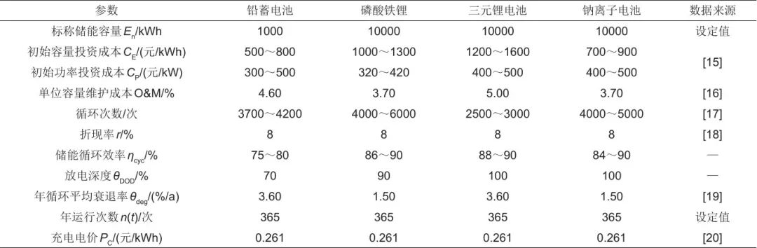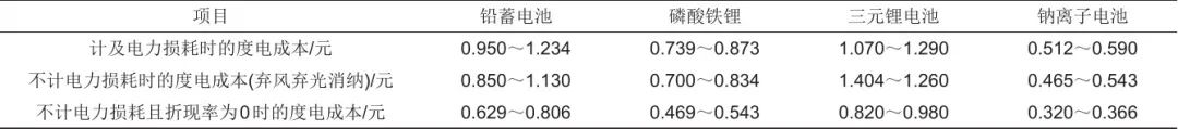 根据调研和文献公开数据,以铅蓄电池、磷酸铁锂电池、三元锂电池和钠离子电池储能为例,采用前述模型计算其在调峰应用场景下的全生命周期度电成本,几种储能技术度电成本对比见表3。