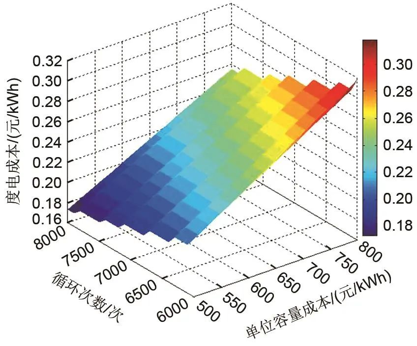 图4 单位容量成本和循环次数对储能度电成本的影响