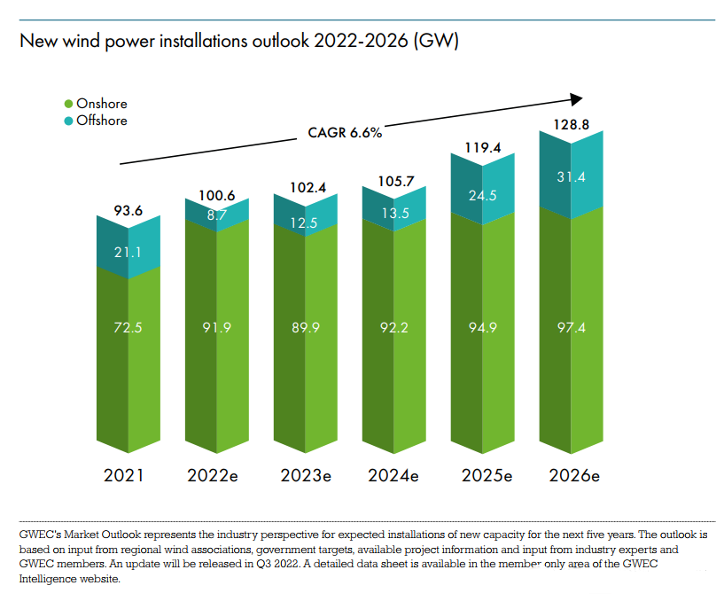 GWEC预测数据显示,到2026年中国风电年新增装机将超过60GW,其中陆上风电超过50GW,海上风电超过10GW。