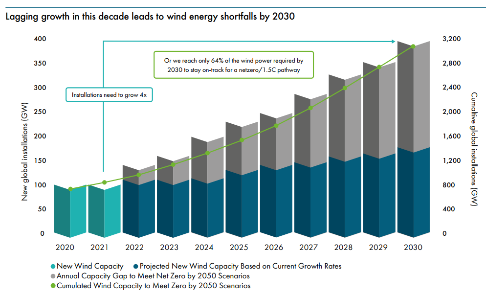 实际上按照当前6.6%~7%的年均复合增速,各国装机规模只能达到2030年阶段性风电装机目标的2/3,距离2050目标则更为遥远。而根据预测数据,2022-2030年的理想年均复合增速至少要保持在17.5%以上。