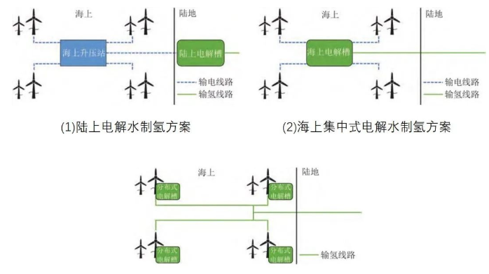 对于陆上电解水制氢方案,海上风电机组产生的电力经海底电缆、升压站等设施输送至陆上电解水制氢系统,其优点是具有较高的灵活性,制氢系统可以作为电网调峰的有效手段,在陆上完成氢气的制取和储运,也具有系统安装维护方便的优势。