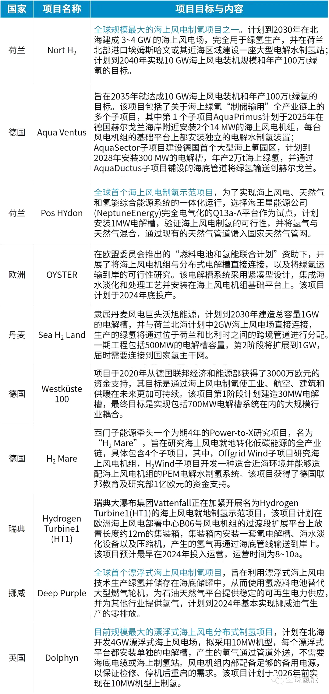 国外海上风电制氢的典型项目主要集中在欧洲,北海海域有大量的已建或待建海上风电项目作为支撑,最先进的绿氢全产业链技术在这里持续孵化,典型的项目如下图所示。