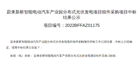 2022年7月,位于合肥新桥智能电动汽车产业园蔚来厂区内,要建设装机容量约为47.0475MW。拟利用蔚来汽车厂区内6个屋顶(总装车间、冲焊联合厂房、电驱电控车间、智慧物流库1#-3#厂房),以及停车场光伏大棚区域作为光伏场地。合同估算价:5103.72万元。