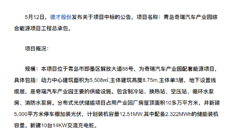 2022年5月12日,奇瑞汽车产业园预备安装10多万平米的屋顶厂房光伏,5000平米的光伏停车棚。