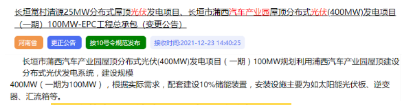 河南省长恒市蒲西预备建设400MW的汽车产业园光伏项目。