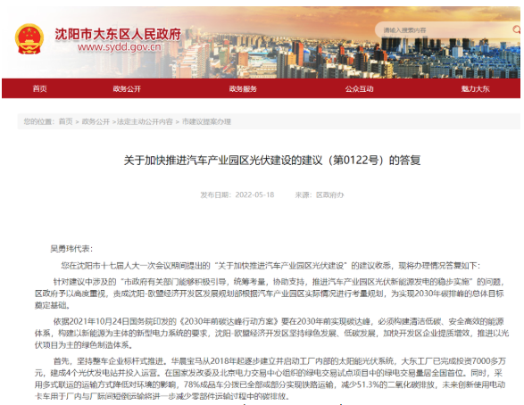 近日,沈阳市大东区人民政府公开内容中可查《关于加快推进汽车产业园区光伏建设的建议(第0122号)的答复》,点赞了汽车产业园区光伏建设的环保效益及标杆效果,园区应坚持加快开发区企业提质增效,推进以光伏项目为主的绿色制造体系。