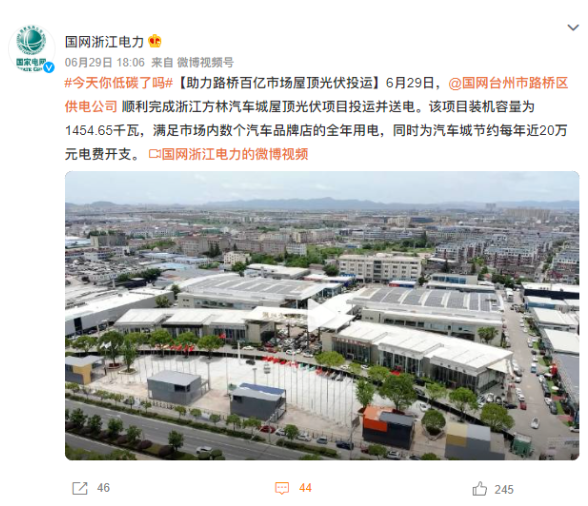 6月29日,路桥区百亿市场——浙江方林汽车城的屋顶光伏项目建成投运,安装面积为15000平方米的太阳能电板。本光伏项目发电模式为自发自用,余电上网,装机容量为1454.65千瓦,理论上年发电量约为160.5万千瓦时。