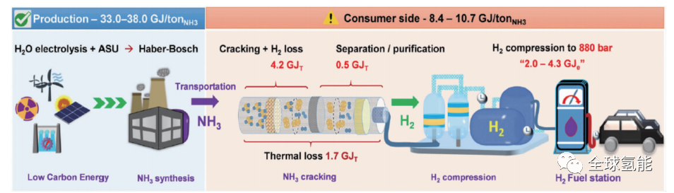 从理想的燃料生产效率和实际运输方面分析,裂解过程需要>500°C的高温才能生产高纯度氢气(>99.97%,特别是用于汽车),这需要4.2GJ/吨氨(包括H2损失)能量输入。由于PEMFC极易受到微量氨的影响(<0.1×10-6),因此氨转化的氢气必须通过高效的纯化和分离系统进行精华提纯,这将额外消耗0.5GJ/吨氨。