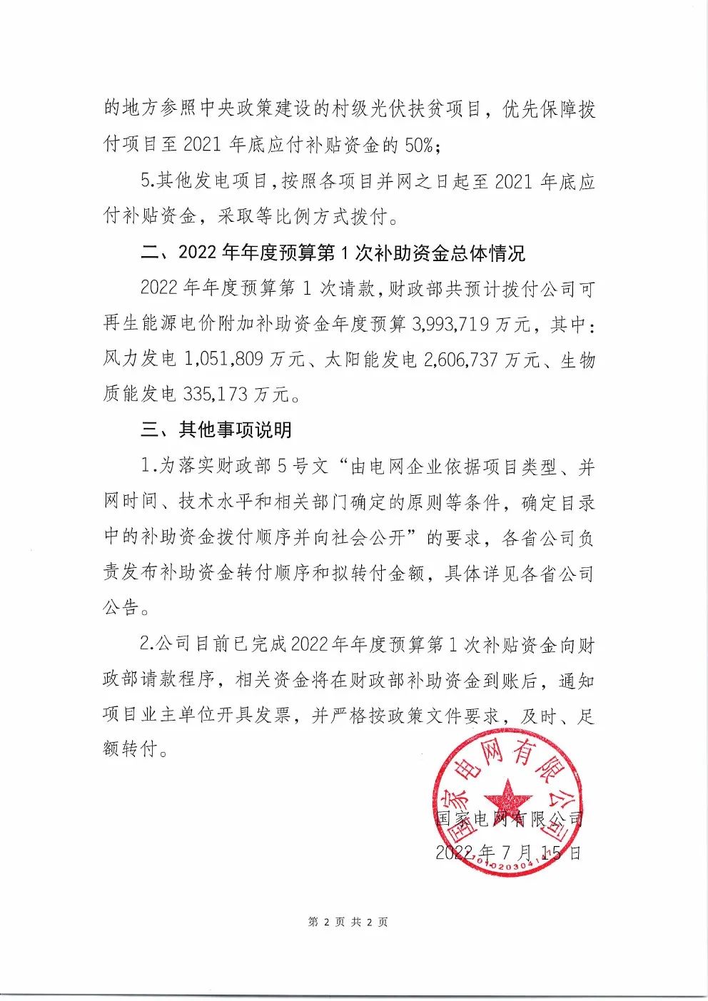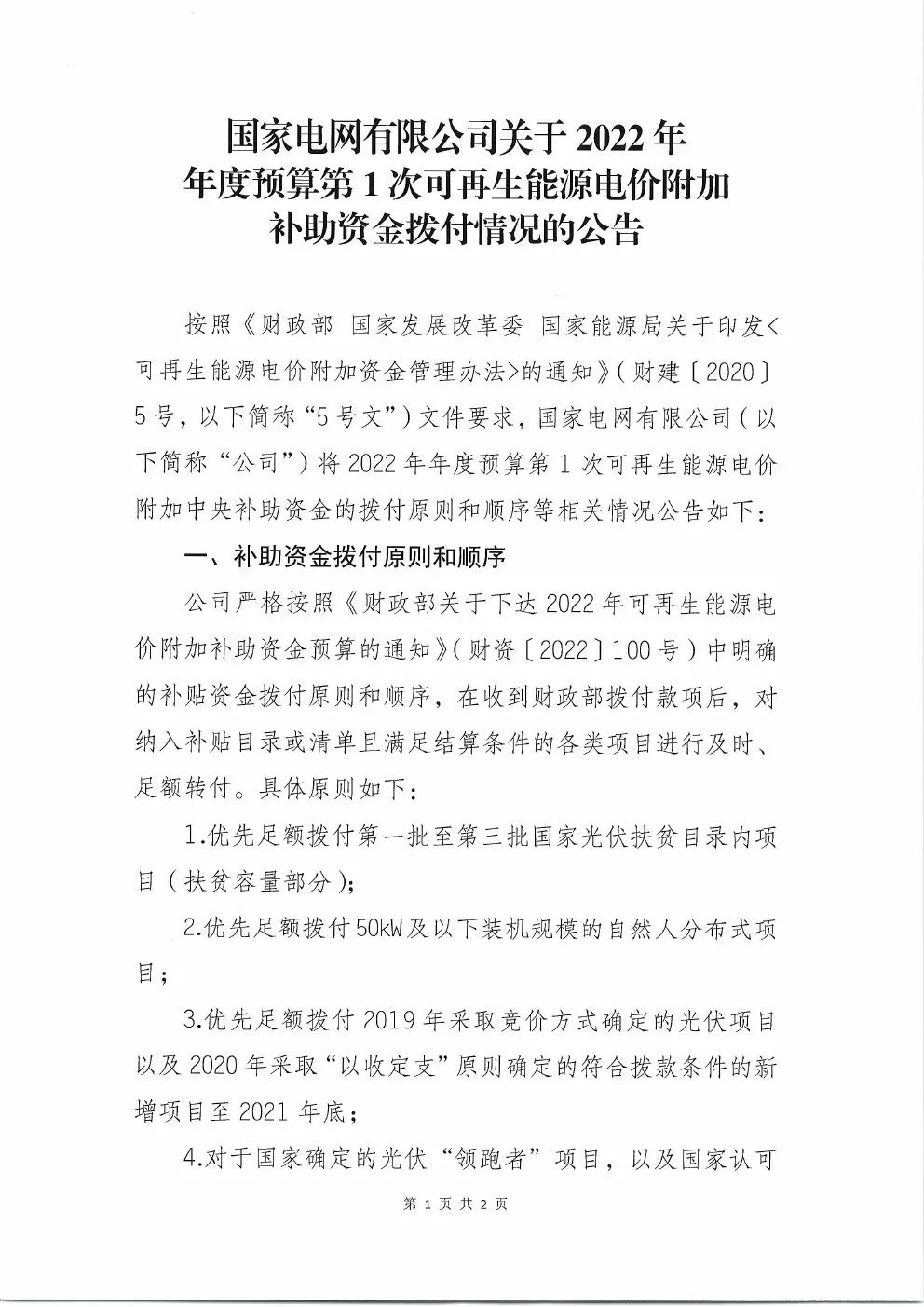 2022年7月15日,国家电网公司发布《国家电网有限公司关于2022年年度预算第1次可再生能源电价附加补助资金拨付情况的公告》,发布2022年第一批补贴资金!