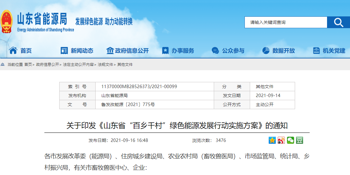 近日,山东省发展和改革委员会、能源局、住房和城乡建设厅、农业农村厅、市场监督管理局、统计局、畜牧兽医局、乡村振兴局八部门联合印发《山东省“百乡千村”绿色能源发展行动实施方案》(以下简称:《方案》)的通知。