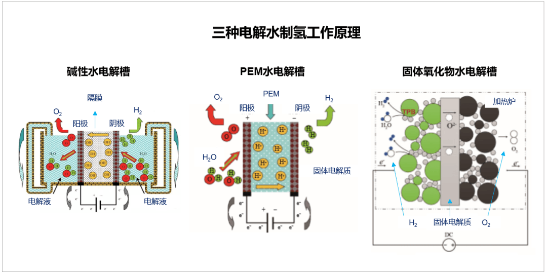 第三种是固体氧化物电解,目前商业化尚不成熟,仍处实验室阶段。