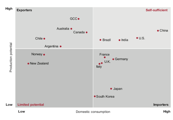 可以看出,以俄罗斯、美国、沙特为代表的传统油气大国正积极致力于成为低碳氢能的生产、出口大国。未来全球氢能贸易的发展或与传统化石燃料的贸易路径类似——欧洲和东北亚将成为主要氢能进口地区,而澳大利亚和中东地区在太阳能利用方面具有独特优势,因此具有巨大的绿氢发展潜力。