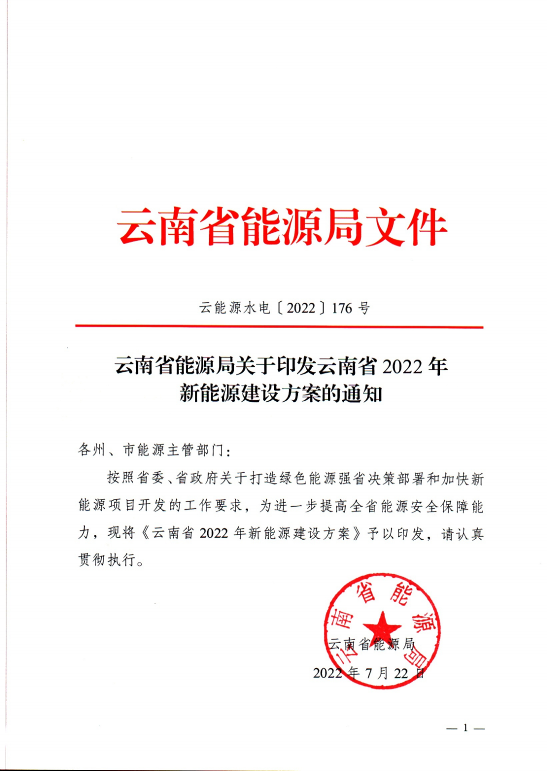 7月22日,云南省能源局发布《关于印发云南省2022年新能源建设方案的通知》。