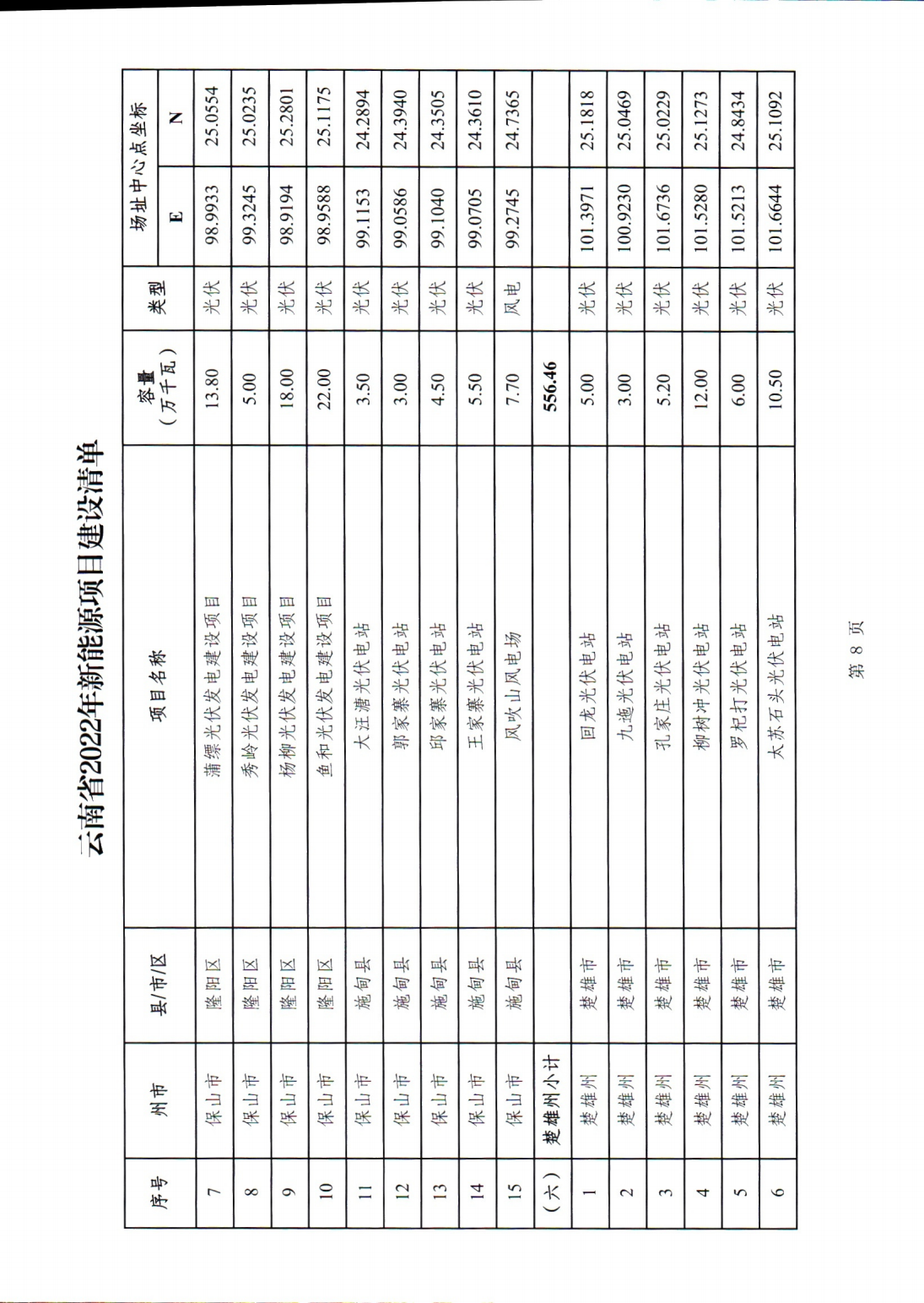 根据《建设方案》,2022年全省加快推动开工新能源项目355个,装机3200.54万千瓦。其中,光伏项目350个,装机3165.04万千瓦;风电项目5个,装机35.5万千瓦;除迪庆州外,全省其他州、市均有布局。确保年度开发新能源规模1500万千瓦以上,力争达2000万千瓦。