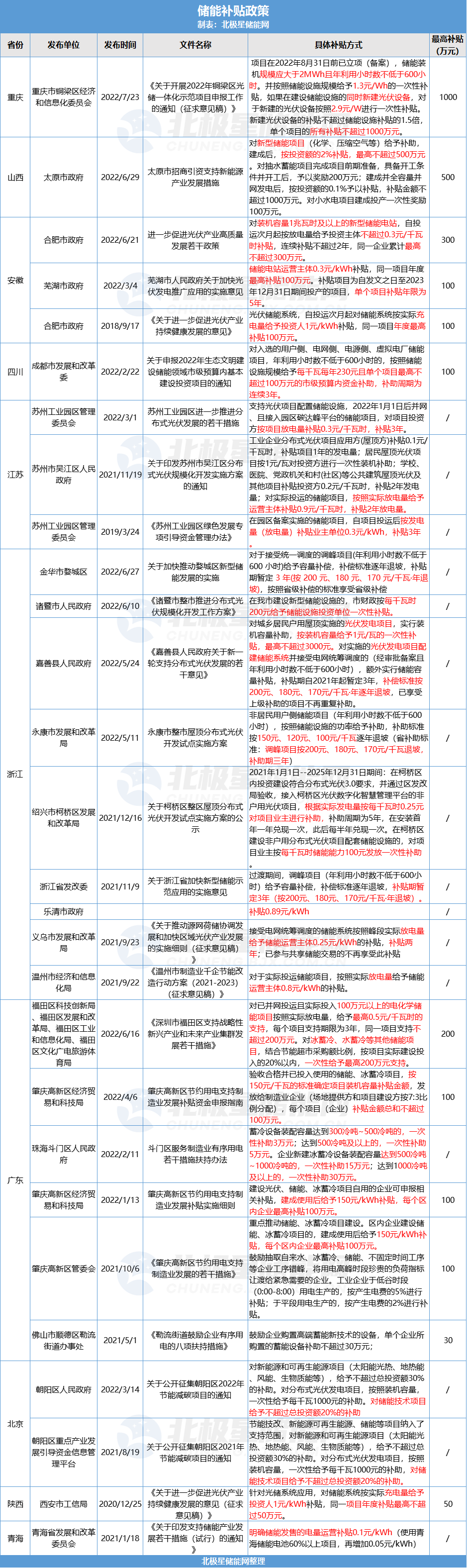 各省市储能补贴、峰谷电价走势及最新电价表详情: