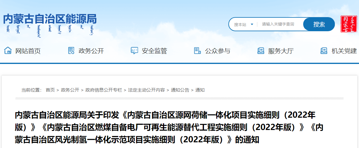 内蒙古自治区能源局关于印发《内蒙古自治区源网荷储一体化项目实施细则(2022年版)》《内蒙古自治区燃煤自备电厂可再生能源替代工程实施细则(2022年版)》《内蒙古自治区风光制氢一体化示范项目实施细则(2022年版)》的通知