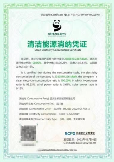 近年来,国网四川省电力公司按照“强电网、快建设、优服务”工作主线,为包括永祥新能源有限公司在内的乐山“中国绿色硅谷”建设提供了坚强的电力要素保障。此次清洁能源消纳凭证的颁发,更让硅谷“绿色”有据可依,有迹可循。 “2022年上半年,企业用电量接近30亿千瓦时,其中水电、风电、太阳能发电生产的清洁电力占比100%,这次颁发的清洁能源消纳凭证,完整展示了企业消费清洁电力的全过程信息,也支持二维码溯源查询。”四川永祥股份有限公司电力总监张锌称。