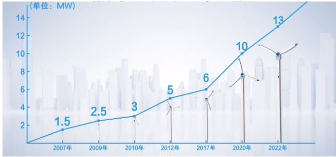 从2007年到2022年,15年的时间,中国海上风机单机容量从1.5兆瓦跃升到下半年的15MW以上,15年我们的风机的单机容量翻了10倍。每年以一个兆瓦的速度在增加。