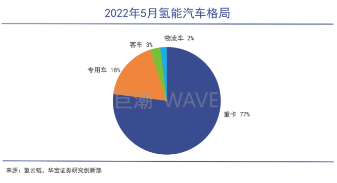 推动氢能汽车销量大增的最大功臣要属重卡。氢云链统计数据显示,今年5月我国氢能重卡、专用车、客车、物流车上险占比分别为77%、18%、 3%和 2%,氢云链预测6月份的情况与5月类似。