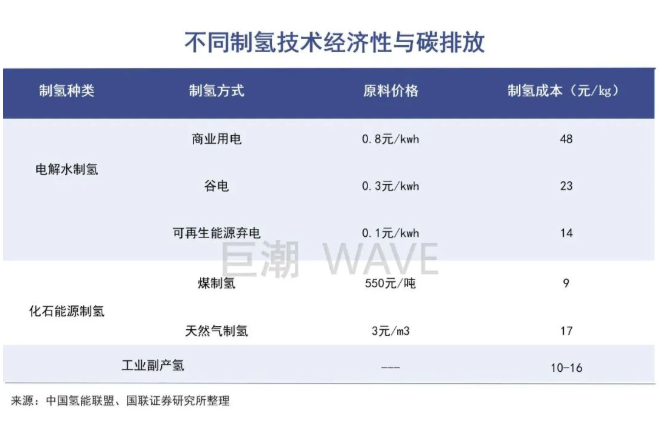 绿氢稀少的原因在于成本高昂,国联证券研究显示,以煤制氢的成本在9元/kg,工业副产气制氢成本在10-16元/kg之间,而如果用商电来进行电解水制氢则要上升至48元/kg。
