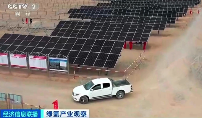 记者来到了新疆库车光伏制绿氢项目的施工现场,整个光伏项目占地达到了9500多亩,相当于900多个足球场的大小。目前整个项目正在紧张施工当中。记者身边这块光伏板,每产生58度绿电,就可以生产出1公斤的氢气。