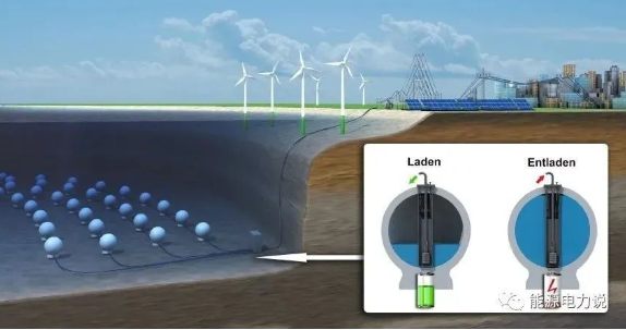 这种储能方式工作原理是:制造直径30米、壁厚3米的混凝土空心球,将其放置海底,球的中心是真空的。储能时,海水被电泵抽到球体之外;发电时,高压海水从管道中流入空心球体中,水流推动水轮机发电。在海下,完成电能的存储和释放。