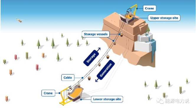 MGES由陡峭山坡、起重机、储存容器(可以装砂石或水)、电缆等组成。储电时,利用余电驱动发动机将装满沙石的缆车从山坡底部移动到顶部,电能转化为势能。发电时,将缆车从山坡顶部下降到底部,势能转化为电能。