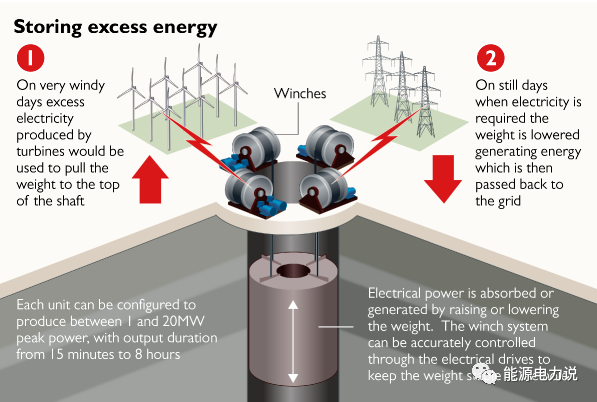 Gravitricity主要瞄准废弃钻井平台与矿坑,重力媒介是500吨的“砝码”,在深度超300米的竖井中重复吊起与放下钻机,通过电动绞盘,先将钻机拉到废弃矿井上方,需要用电时再让钻机放下,如此进行储存和释放电能。