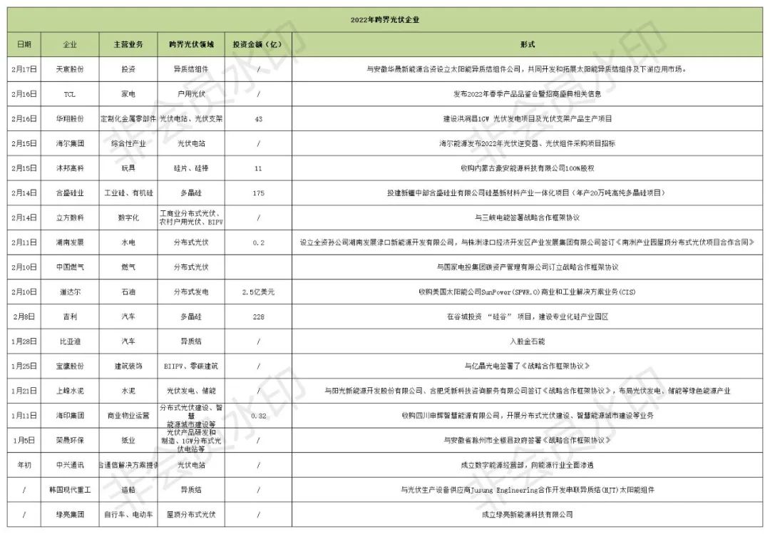 据公开信息不完全统计,开年至今已有不少于19家企业宣布进军光伏,分布式光伏、硅料、异质结仍为跨界焦点,跨界投资金额超570亿。跨界公司更是五花八门,涵盖玩具、水电、燃气、传统能源、汽车、水泥、纸业、造船等领域的企业。2022年的一场光伏跨界大戏正在拉开序幕。(相关阅读:光伏“跨界潮”:55家企业巨资涌入,光伏玻璃、HJT、分布式成跨界新宠)