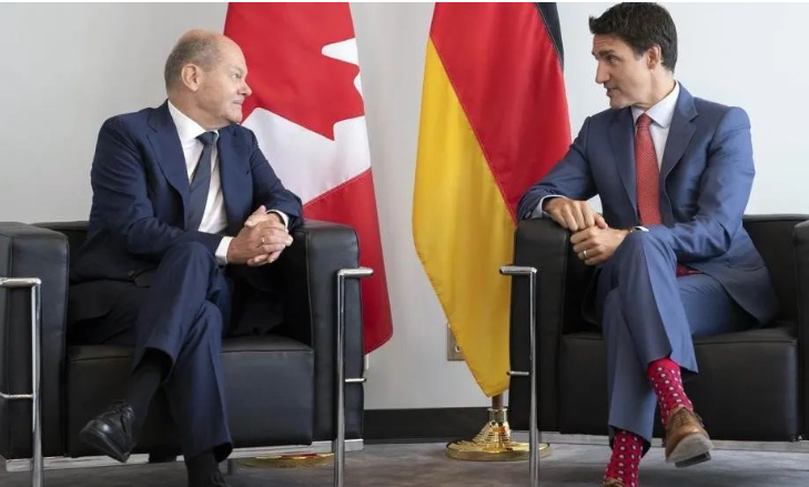 图说:加拿大总理特鲁多与德国总理舒尔茨交谈