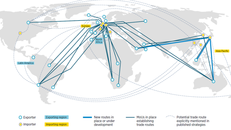 图说:不断扩大的氢气贸易路线、计划和协议网络