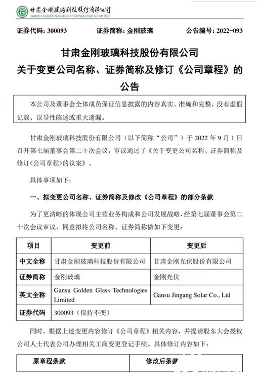 根据公告,为了更清晰地体现公司主营业务构成和公司发展战略,经第七届董事会第二十次会议审议,同意拟将公司名称由“甘肃金刚玻璃科技股份有限公司”变更为“甘肃金刚光伏股份有限公司”,证券简称由“金刚玻璃”变更为“金刚光伏”。