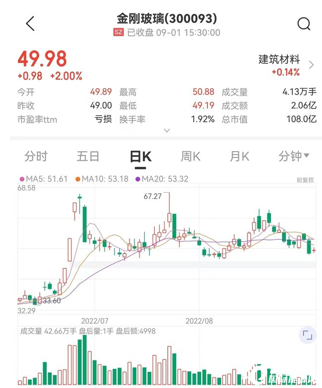 受跨界光伏等利好消息带动,4月底以来,金刚玻璃一路上扬。截至9月1日,金刚玻璃报49.98元/股,最新市值108亿元。