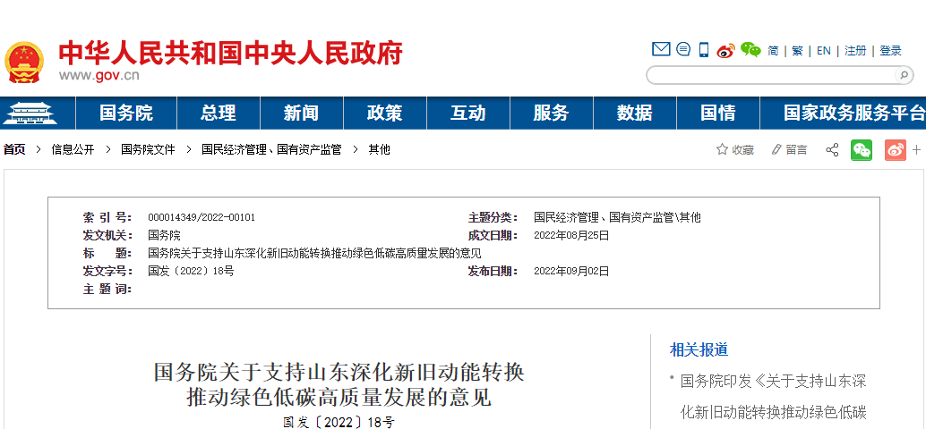 9月2日,国务院发布《关于支持山东深化新旧动能转换推动绿色低碳高质量发展的意见》。