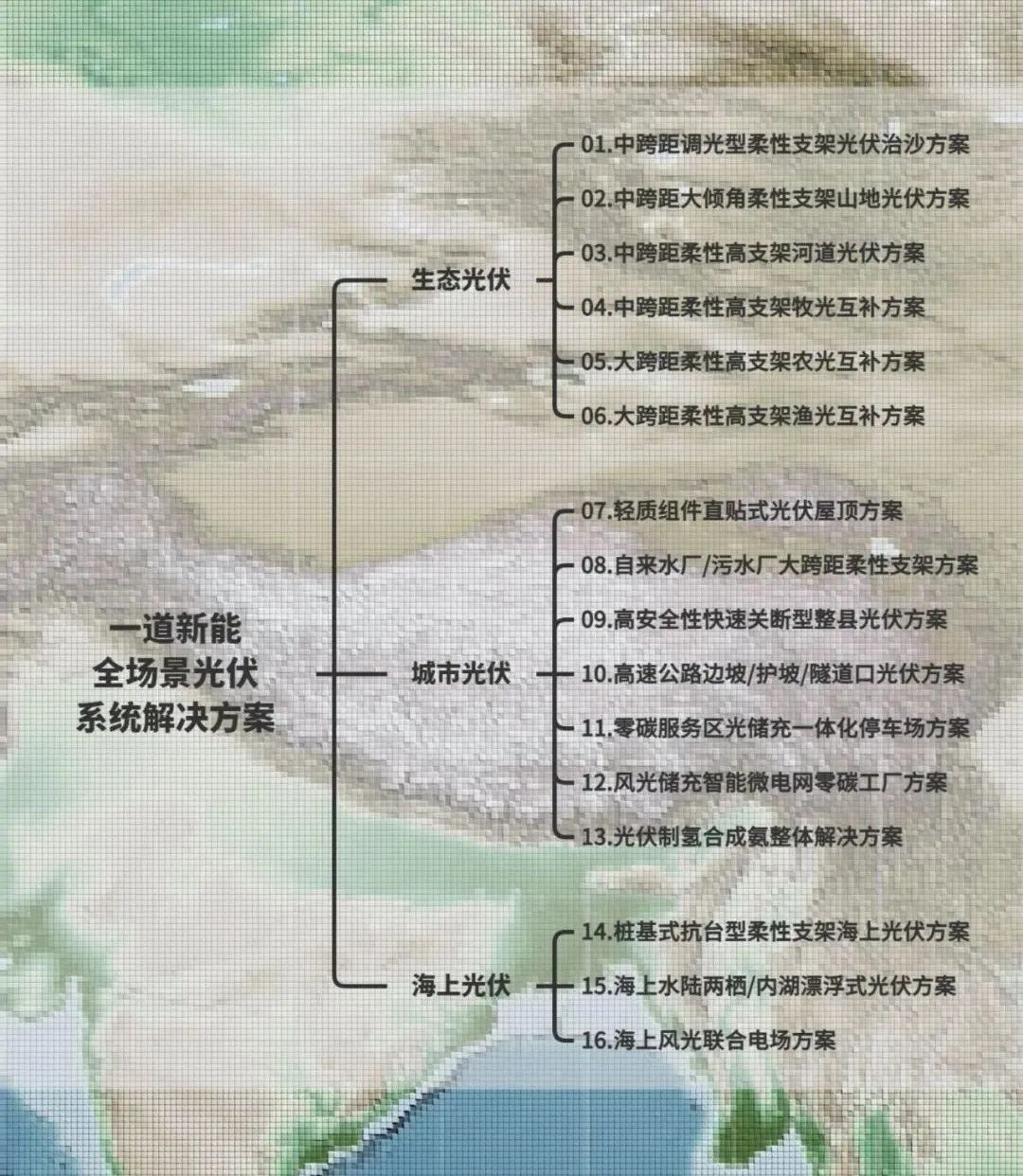 一道新能以度电成本为导向,分别就技术路线规划、失效模式分析、总体布局设计、关键物料开发、工程量清单编制等环节进行深入研究,将海上光伏场景细分为滩涂调光型柔性支架+海水稻方案、潮间带水陆两栖漂浮式方案、抗台型桩基式柔性支架方案、风光同场近海漂浮式光伏方案四大类,并分别进行技术研究、产品开发、方案创新。