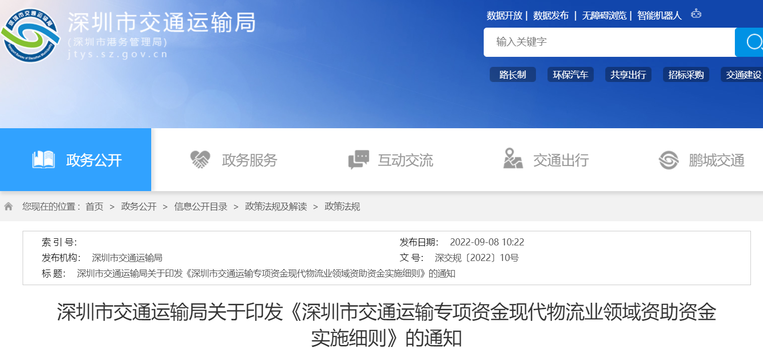 9月8日,广东省深圳市交通运输局发布《深圳市交通运输专项资金现代物流业领域资助资金实施细则》,该细则资助项目包含:市重点物流企业贴息资助项目、智能快件箱资助项目、运输结构调整资助项目、冷链物流发展资助项目、物博会展位费资助项目、深圳市政府批准的其他项目。
