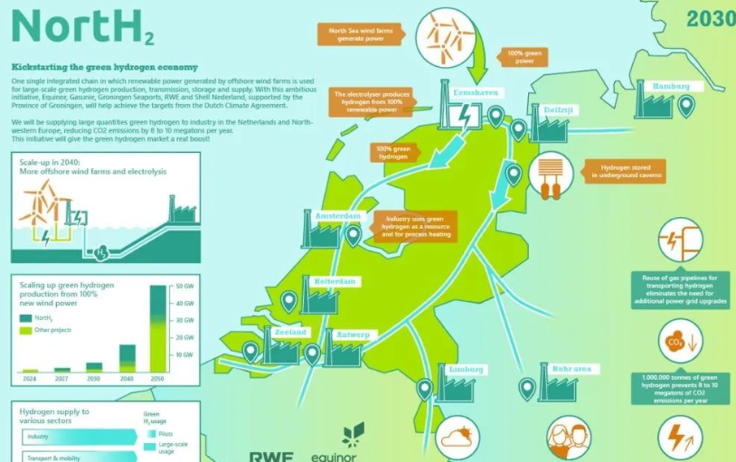 荷兰NortH2,位于荷兰北部Eemshaven附近,由Shell、Equinor、RWE、Gasunie、Groningen Seaports合作开发,目前已完成可行性研究的第二阶段,预计2040年全部建成,氢气产量也是每年100万吨。