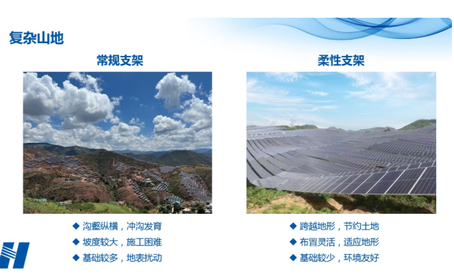 华能清能院蒋河川博士在题为《关于光伏柔性支架产业发展的思考》报告中介绍了光伏产业发展政策和趋势、光伏柔性支架及场景需求分析、华能光伏柔性支架应用与研究、技术分析与展望等方面内容。他提到,柔性支架具备“大跨度、高净空、低成本、环境友好”等特点。通过不同地形条件下固定支架和柔性支架的建设对比发现:柔性支架可以跨越地形,节约土地;布置灵活,适应地形;基础较少,环境友好。蒋河川博士总结了华能集团在贵州望谟、镇宁,青海塔拉滩等项目上光伏柔性支架应用情况。他指出,柔性支架的应用提高了土地的利用率,达到了降本增效的效果,并表示柔性支架在复杂山地、农牧光综合项目、渔光综合项目、茶光综合项目、分布式光伏、沙戈荒大基地、近海滩涂光伏、矿区治理等领域应用具备市场潜力。华能清能院作为华能的新能源技术研发中心,聚焦柔性支架的设计优化、可靠性验证、运维监测等技术研究,并致力于技术的标准化和规范化,以推动行业的发展。