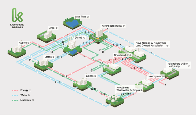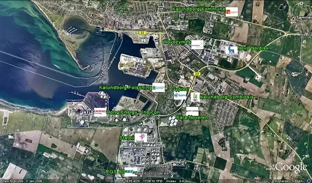 Novo Nordisk制药公司,年销售额约20亿美元,公司生产医药和工业用酶,是丹麦最大的制药公司。该公司在生态工业园区中还担任着连接农业的重任,例如制药厂的原材料土豆粉、玉米淀粉发酵产生的废渣、废水以及污泥等废弃物,经杀菌消毒后被农民用作肥料;胰岛素生产过程的残余物酵母被用来喂猪等。