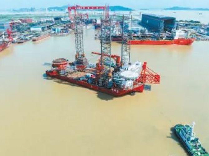 今年6月29日,由中国三峡集团投资建造的国内首艘2000吨级海上风电安装平台——“白鹤滩”号在广东省广州市顺利出坞下水。据了解,其甲板面积为4200平方米,足有10个篮球场大,这为施工作业提供了广阔空间。