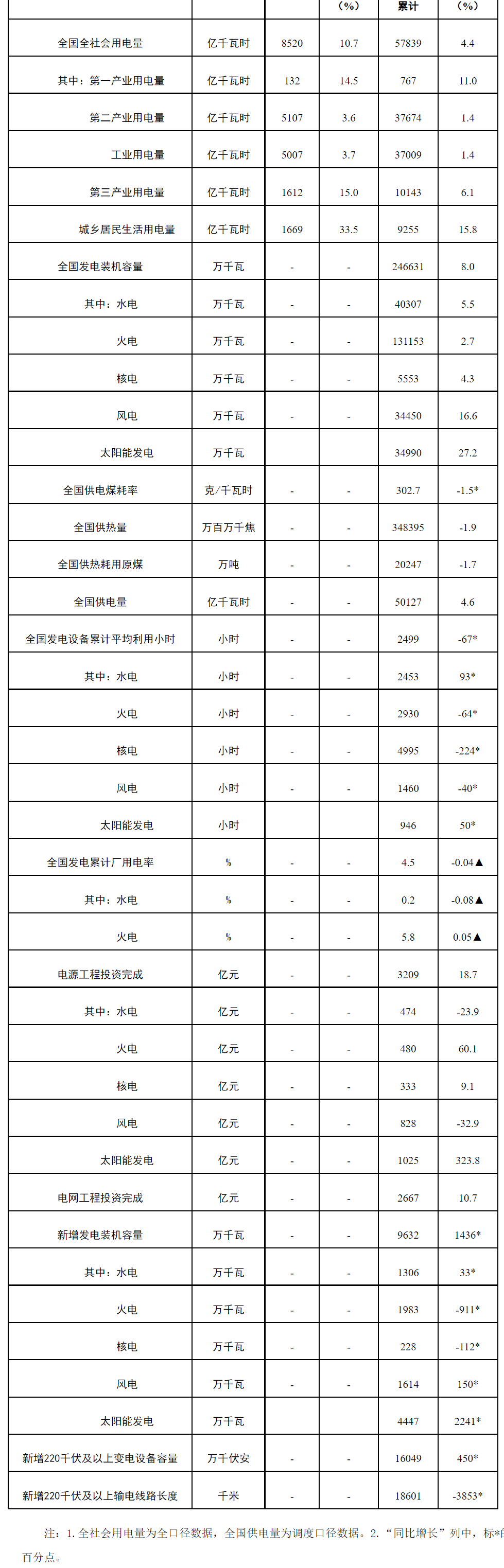 1-8月份,全国发电设备累计平均利用2499小时,比上年同期减少67小时。其中,火电2930小时,比上年同期减少64小时;核电4995小时,比上年同期减少224小时;风电1460小时,比上年同期减少40小时。