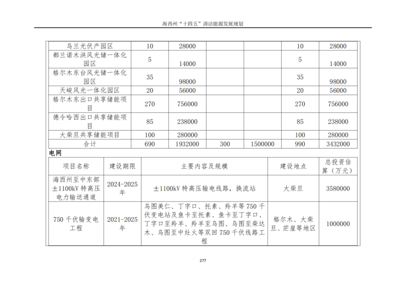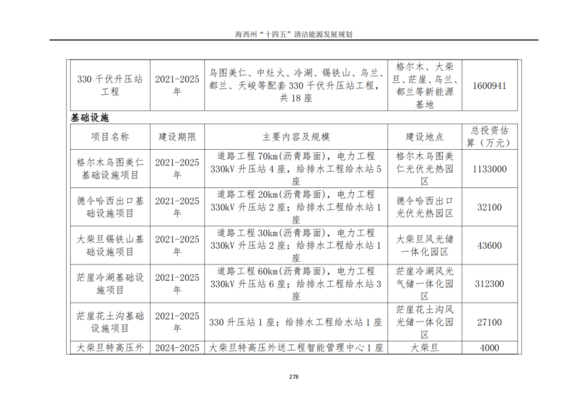 投资情况方面,海西州“十四五”规划推荐方案光伏新增1520万千瓦,投资需求约494亿元;风电新增830万千瓦,投资需求约539.5.5亿元,光热55万千瓦,投资需求约119亿元;新能源发电配套电化学储能投资约193.2亿元;基础设施投资约256亿元;特高压外送通道工程投资约358亿元;清洁能源配套产业和技术研究投资约305亿元。“十四五”规划新增各类项目总投资合计约2311.7亿元。