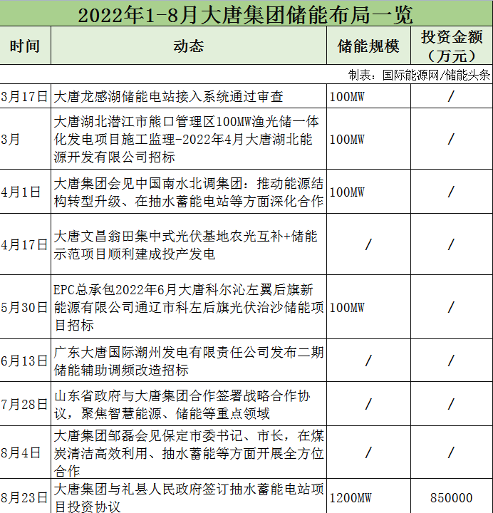 据不完全统计,2022年1-8月,大唐集团储能项目招标3个,与山东、保定、南水北调集团等签订合作协议,涉及抽水蓄能、智慧能源等领域。