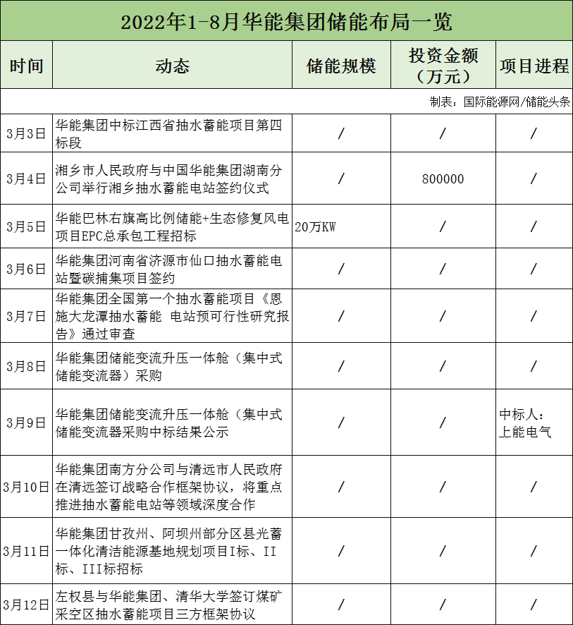 2022年,华能集团全国第一个抽水蓄能项目《恩施大龙潭抽水蓄能电站预可行性研究报告》通过审查;与湘乡市、左权县等地签订抽水蓄能项目合作协议,储能项目招标4个,涉及储能变流器、光蓄一体化等方面。