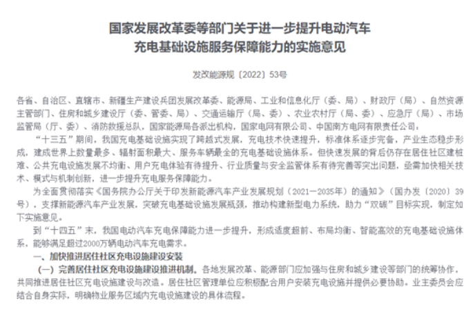 从政策层面来看,今年1月,国家发展改革委等十部门联合发布了《关于进一步提升电动汽车充电基础设施服务保障能力的实施意见》。在《实施意见》中,第一部分内容就是关于“加快推进居住社区充电设施建设安装”。