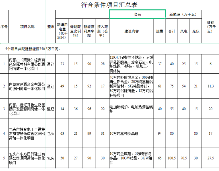 (五)包头市东方日升硅业有限公司源网荷储一体化项目,新增负荷65万千瓦,配建新能源规模100.5万千瓦,其中,风电70.5万千瓦、光伏30万千瓦、储能27.5万千瓦。