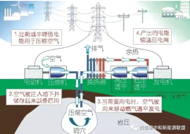 压缩空气储能是利用剩余电力压缩空气,并将其储藏在高压密封设施内,需要时再释放出来驱动汽轮机发电。这种技术多年前就已经出现,关键在于成本:大容量、密封性好的容器是很贵的。利用开采盐矿后剩余的矿洞来储存压缩空气是这一领域最新的发展趋势,我国目前已有示范性项目即将建成。