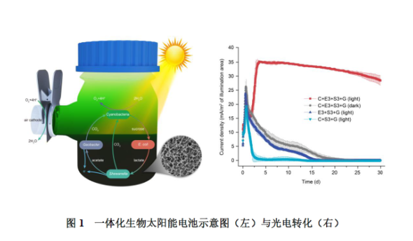 进一步,研究针对蓝藻光合放氧与异养微生物厌氧产电之间存在的矛盾,阻断了大肠杆菌和希瓦氏菌的好氧呼吸途径,并开发了具有隔氧性能的导电水凝胶,将大肠杆菌、希瓦氏菌和地杆菌封装起来,形成能够隔氧且能进行电子传递的人工沉积层。研究将人工沉积层与含有蓝藻的水柱层组装在一起,制造出一体化的生物太阳能电池,可直接将光能转化为电能,并稳定运行1个月以上(图1)。