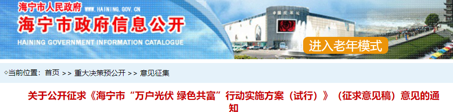 为深入贯彻落实中央、省委、嘉兴市委关于共同富裕和“碳达峰、碳中和”的一系列决策部署,加快推进居民户用屋顶光伏项目建设,实现绿色低碳共同富裕,我局拟定了《海宁市“万户光伏 绿色共富”行动实施方案(试行)》(征求意见稿)。现将《海宁市“万户光伏 绿色共富”行动实施方案(试行)》(征求意见稿)予以公示,公示期内若有意见,可书面或电话反馈至海宁市发展和改革局。