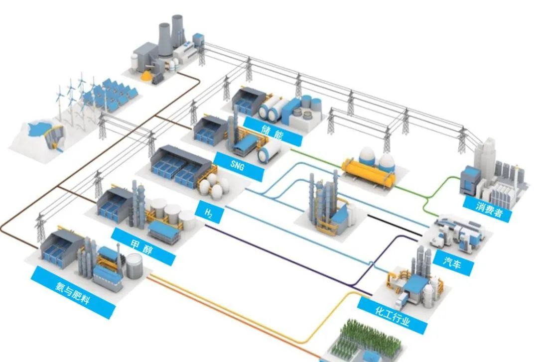 利用清洁能源电力电解技术得到氢气,将氢气存储于高效储氢装置中,再利用燃料电池技术,将存储的能量回馈到电网,或者将存储的高纯度氢气送入氢产业链直接利用。